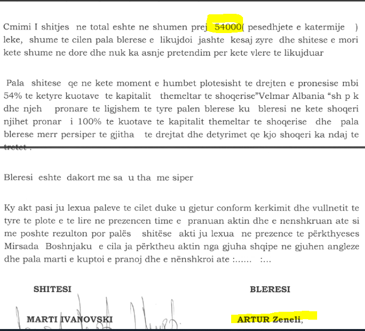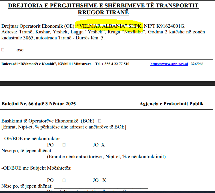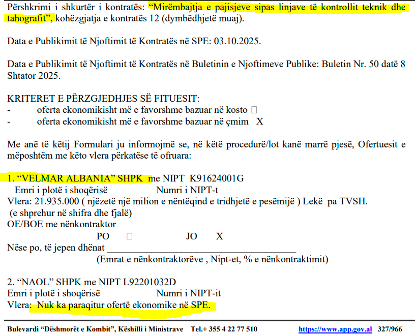 Një nga këta klientë është edhe Artur Zeneli, pronari i firmës “VELMAR ALBANIA” SHPK, i cili së fundmi ka përfituar kontratën: Mirëmbajtja e pajisjeve sipas linjave të kontrollit teknik dhe tahografit”, me kohëzgjatje prokurimi është regjitruar 1 vit. Ky tender është njoftuar më 8 shtator 2025 dhe është mbyllur në 3 tetor.