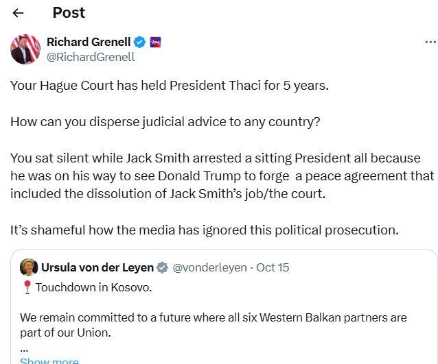 “Gjykata juaj e Hagës e ka mbajtur Presidentin Thaçi për 5 vjet. Si mund t’i shpërndani këshilla gjyqësore ndonjë vendi? Ju qëndruat të heshtur ndërsa Jack Smith arrestoi një President në detyrë, vetëm sepse ai ishte duke shkuar për të takuar Donald Trump për të krijuar një marrëveshje paqeje që përfshinte shpërbërjen e punës së Jack Smith/gjykatës. Është e turpshme se si media e ka injoruar këtë ndjekje penale politike.”, shkruan Grenell në X.