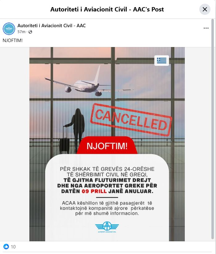 “Për shkak të grevës 24-orëshe të shërbimit civil në Greqi, të gjitha fluturimet drejt dhe nga aeroportet greke për datën 9 prill janë anuluar. ACAA këshillon të gjithë pasagjerët të kontaktojnë kompanitë ajrore përkatëse për më shumë informacion”, thuhet në njoftim.