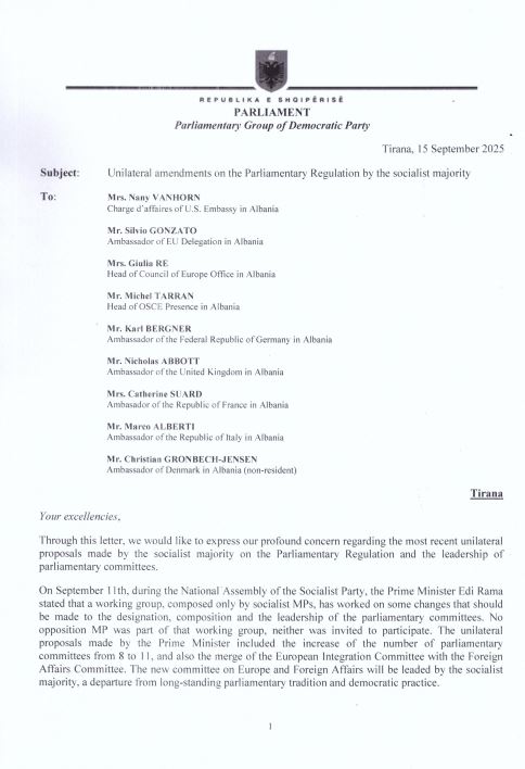 Kryetari i Grupit Parlamentar të Partisë Demokratike, Gazment Bardhi në një letër drejtuar nëntë ambasadave në Tiranë, përfshirë ambasadën e Shteteve të Bashkuara dhe Delegacionin e Bashkimit Evropian, ka ngritur shqetësimin mbi ndryshimet e propozuara nga Edi Rama në Rregulloren e Parlamentit gjatë Asamblesë Kombëtare të PS-së në 11 shtator.