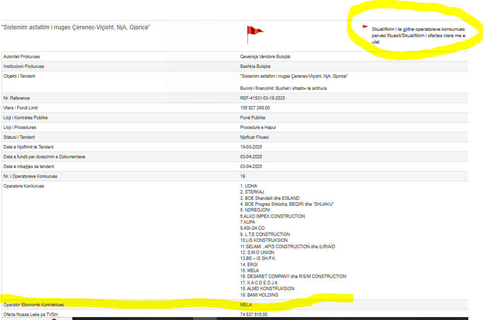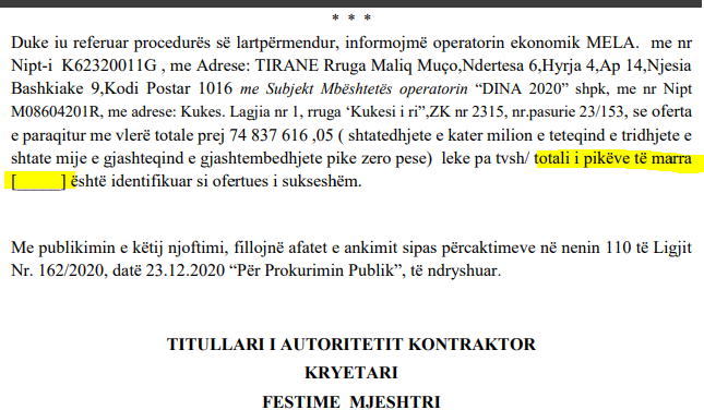 Kryetarja sapo e ka parë në derë Lalën ka vendosur t’ia japë tenderin, pavarësisht se ky nuk i plotëson kriteret dhe ka ofertën më shtrenjtë. “Skualifikim i të gjithë operatorëve konkurrues përveç fituesit/ Skualifikim i ofertës me vlerë më të ulët”, kështu e klasifikon Open Data Albania procedurën e firmosur nga Festime Mjeshtri. Për shkeljet e kryera tenderi është shënuar me “Flamur të kuq’, që është shenja e riskut të korrupsionit.
