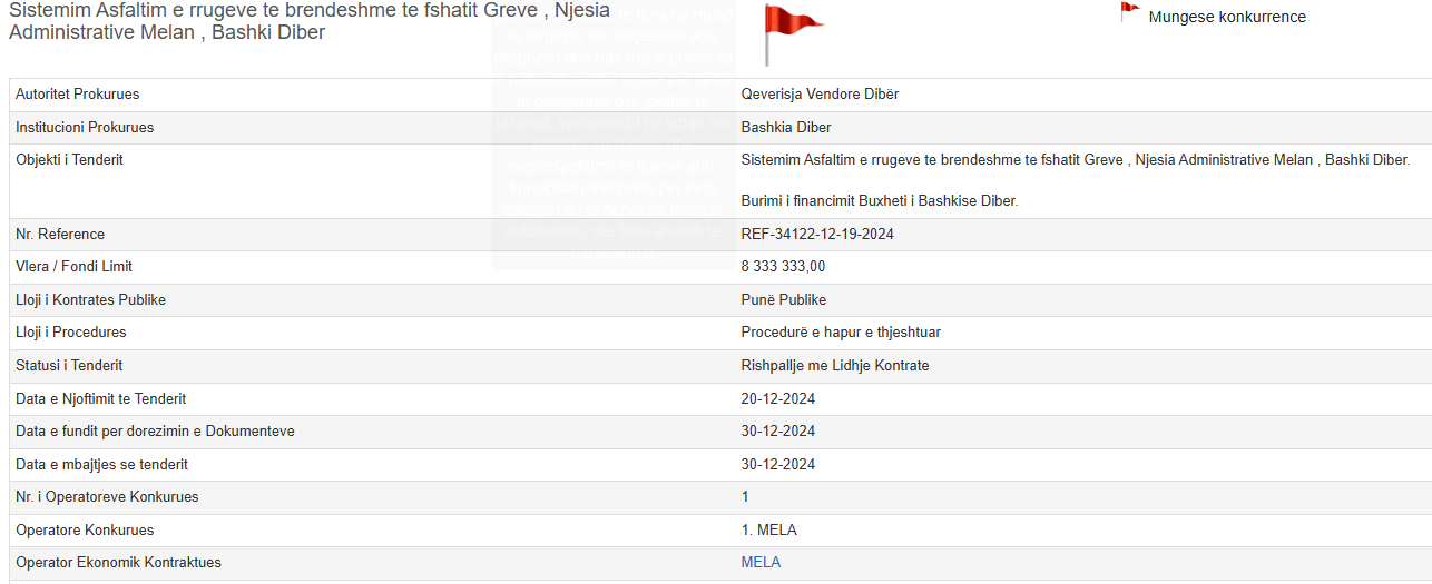 Kështu para zgjedhjeve, më 5 shkurt 2025, nga bashkia Dibër, MELA ka marrë kontratën “Sistemim Asfaltim e rrugëve të brendshme të fshatit Grevë, Njësia Administrative Melan, Bashkia Dibër”. Vlera e tenderit është 8 333 333,00 lekë pa TVSH.