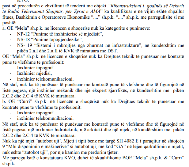 Duke mos i paragjykuar arsyet e paraqitura nga komisioni për skualifikimin e konkurrentëve të tjerë, gijotina.com konstaton se ndaj fituesit nuk është bërë verifikimi nëse i plotëson kushtet dhe kriteret e shpallura për tenderin.