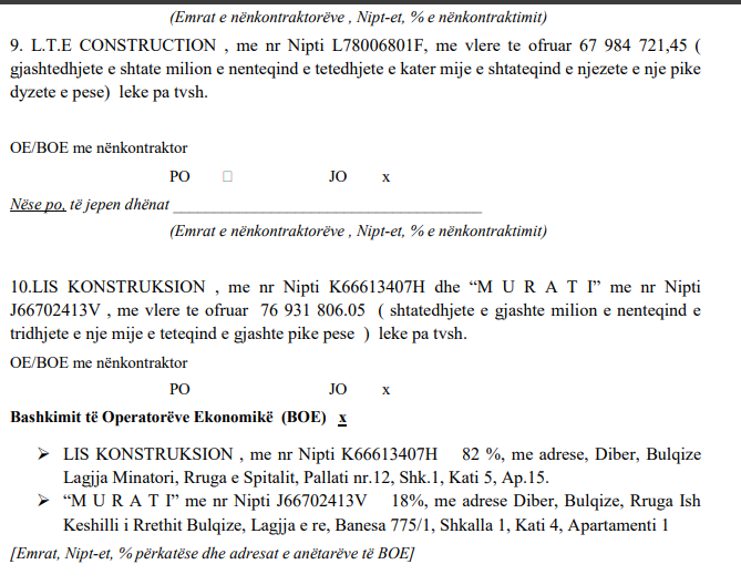 Oferta fituese e Mehdi Lalës është 74 837 616,00 lekë pa TVSH, ndërkohë që një nga ofertat e skualifikuara e propozuar nga L.T.E CONSTRUCTION , është me vlerë 67 984 721,45 lekë pa tvsh.