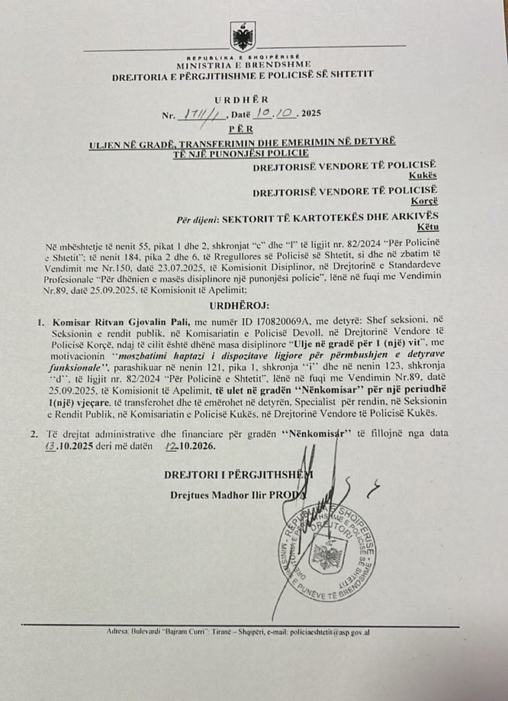 Më 10 tetor 2025, drejtori i Përgjithshëm i Policisë së Shtetit, Ilir Proda, ka firmosur transferimin e Ridvan Palit në Kukës, ku është emëruar si specialist për rendin në Seksionin e Rendit Publik. Kjo është goditja më e fundit ndaj Palit, i cili u vu në shënjestër të drejtuesve të Policisë pas arrestimit të Altin Morinës, një ish-efektiv i RENEA-s dhe mik i ngushtë i vetë Prodës, i shpallur në kërkim nga SPAK për trafik droge dhe lidhje me organizata kriminale.