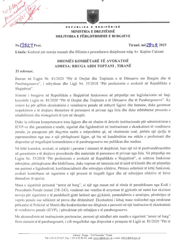 Në kërkesën drejtuar Dhomës Kombëtare të Avokatisë, Burgjet akuzojnë avokatin se ka shkelur rregullat, pasi ka lejuar që Ilir Meta të realizojë një audio-intervistë nga ambientet e paraburgimit.