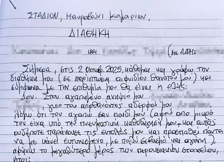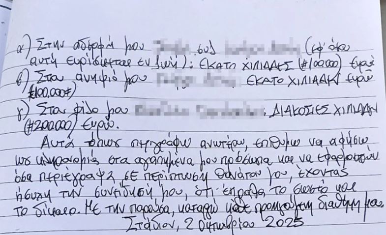 Pronari i kampingut AMMOS në Finikounda, i vrarë së bashku me mikun e tij shqiptar, i kishte lënë pjesën më të madhe të pasurisë nipit të tij, sipas një testamenti të hartuar vetëm tre ditë para vrasjes. Ky nip ishte gjithashtu dëshmitar i krimit të dyfishtë. Në fillim të testamentit, 68-vjeçari shkruan: “Unë shkruaj testamentin tim në rast vdekjeje të papritur”, duke lënë të kuptohet se kishte frikë për jetën e tij.