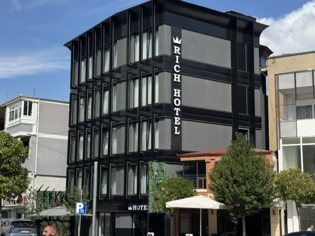 Mes rrugicave të mbushura me hotele e lokale, të bie në sy një fasadë moderne xhami në ngjyrat gri e të zezë. Ndërsa gjatë natës, duket si fasadë e ndriçuar xhami, që tërheq vëmendje mes hoteleve të tjera në ato rrugica. E në të djathtë lexohet që prej së largu emri i tij, Rich Hotel, shoqëruar me një kurorë, si simbol i luksit mbretëror, si dhe vetë pronarët e reklamojnë komoditetin që i ofrojnë klientëve.