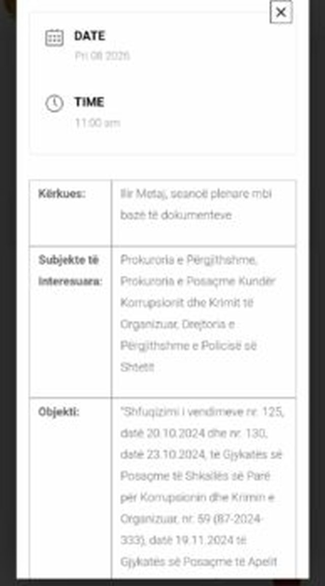 Më datën 8 prill ora 11:00, Gjykata Kushtetuese  do të shqyrtojë ankimimin e  ish-presidentit të Republikës, Ilir Meta, kundër masave të sigurisë “arrest në burg”.