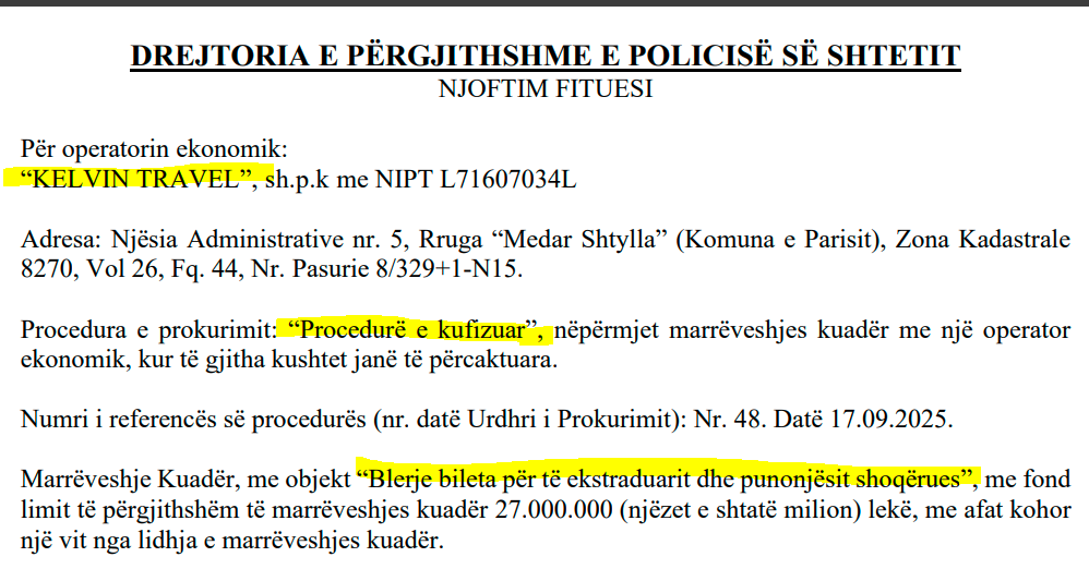 Këtë veprim të Drejtorisë së Përgjithshme të Policisë e mësuam nga njoftimi i fituesit “KELVIN TRAVEL”, sh.p.k me NIPT L71607034L, shpallur në Agjencinë e Prokurimit Publik.