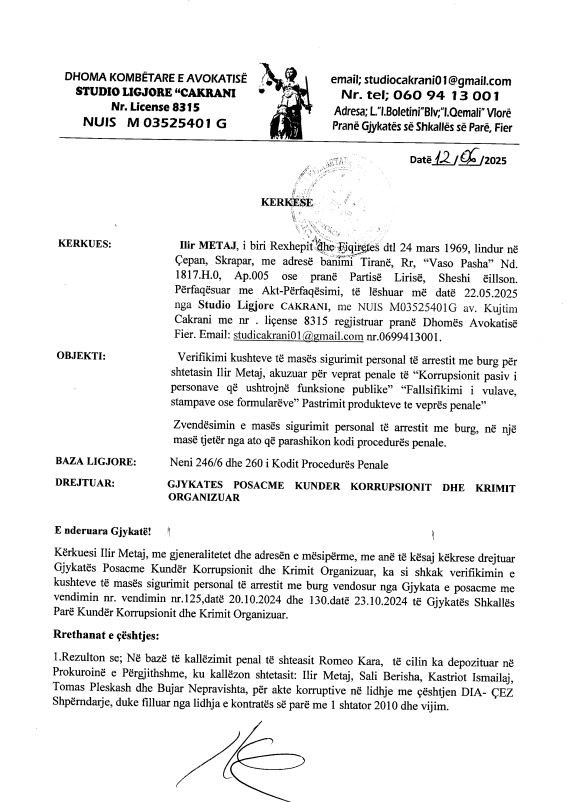 “Në gjithë këtë periudhë 8 mujore të hetimit nën masën shtrëngues të arrestit me burg, kërkuesi shtetasi Ilir Metaj ka qenë në dispozicion të organit akuzës ashtu siç ka qenë edhe më parë, ka pritur qetësisht të pyetej dhe të jepte shpjegime rreth hetimeve, por edhe për të kryer qoftë edhe ballafaqime në funksion të zbardhjes së ngjarjeve apo rasteve që organi akuzës i cilëson si kriminale.