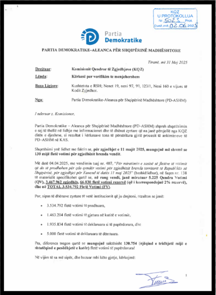 Sipas PD-së, referuar shifrave të publikuara nga vetë KQZ, ka një diferencë prej mbi 130 mijë votash, mes fletëve që gjenden në kuti dhe atyre të printuara. Në kërkesën e PD flitet vetëm për fletët e përdorura brenda vendit.