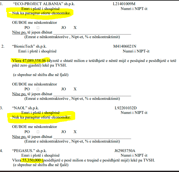 Konkretisht, “ECO-PROJECT ALBANIA” sh.p.k. sipas komsionit të tenderit, “nuk ka paraqitur ofertë ekonomike”. Po ashtu, “NAOL” sh.p.k. nuk ka paraqitur asnjë dokument.