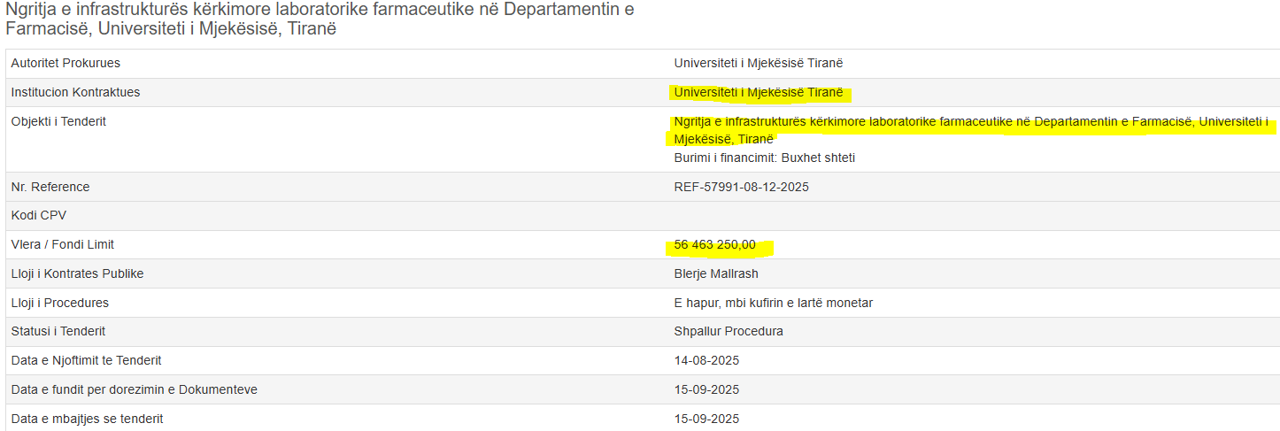 Bëhet fjalë për tenderin e Universitetit të Mjekësisë Tiranë me objekt “Ngritja e infrastrukturës kërkimore laboratorike farmaceutike në Departamentin e Farmacisë, Universiteti i Mjekësisë, Tiranë”. Fondi limit i caktuar për këtë projekt është 56 463 250,00 lekë pa TVSH dhe dokumentet janë plotësuar qysh në muajin gusht 2025.