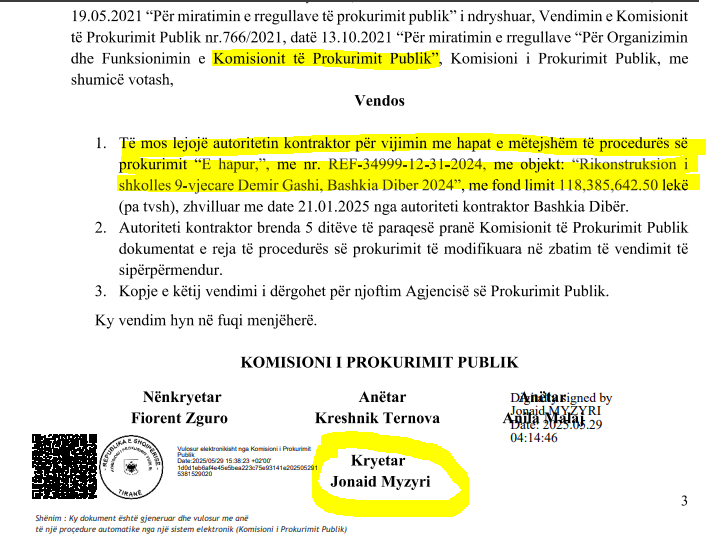 Veprimet e KPP mund të përmblidhen në tri fjalë: Jepjani tenderin Abazit! Në mbledhjen e datës 28 maj 2025, Komisioni i Prokurimit Publik mori në shqyrtim për herë të dytë procedurën e prokurimit me objekt “Rikonstruksion i shkollës 9-vjeçare Demir Gashi, Bashkia Dibër 2024”. Kryetar Myzyri ishte i pakënaqur nga moszbatimi i vendimit të KKP i datës 29 prill 2025 për tenderin e zhvilluar me datë 21 janar 2025 nga Bashkia Dibër.