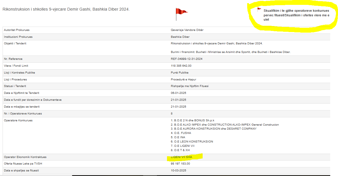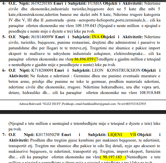 Kështu, për t’i hapur rrugën firmës “LIQENI VII” SHA me pronar Ramazan Kalian, është eliminuar BONUS Sh.p.k me ofertën 88.196.167 lekë pa TVSH. Po ashtu, është skualifikuar kompania “INA” shpk e cila propozon ta bëjë këtë punë me 86.896.059 lekë pa TVSH.