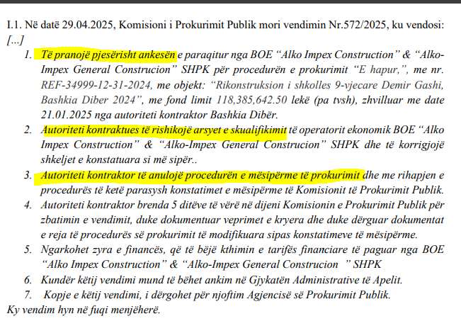 KPP e kishte pranuar kërkesën e Abazit për shfuqizimin e vendimit të Spahiut që e kishte skualifikuar nga gara, Ndërkohë urdhërohej Bashkia Dibër “të rishikojë arsyet e skualifikimit të operatorit ekonomik BOE “Alko Impex Construction” & “Alko-Impex General Construcion” SHPK dhe të korrigjojë shkeljet e konstatuara”.