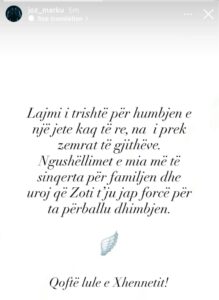 “Lajmi i trishtë për humbjen e një jete kaq të re, na i prek zemrat të gjithëve. Ngushëllimet e mia më të sinqerta për familjen dhe uroj që Zoti t’ju jap forcë për ta përballu dhimbjen. Qoftë lule e Xhennetit!”- shkroi ai në Instastory.