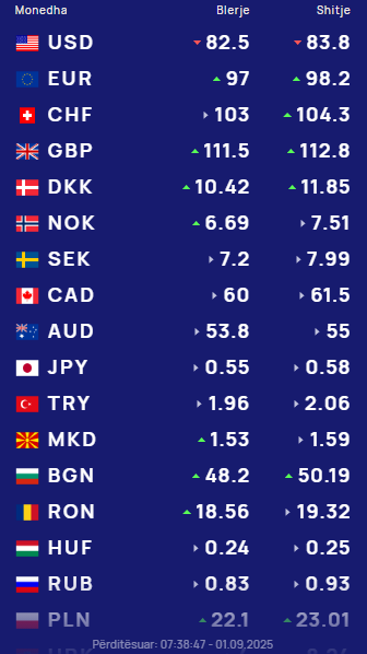 Në tregun e këmbimit valutor, ditën e sotme (e hënë, 1 Shtator), një dollar amerikan do të blihet me 82.5 lekë dhe do të shitet me 83.8 lekë. Euro sot në tregun shqiptar të këmbimit valutor do të blihet me 97 lekë dhe do të shitet me 98.2 lekë.
