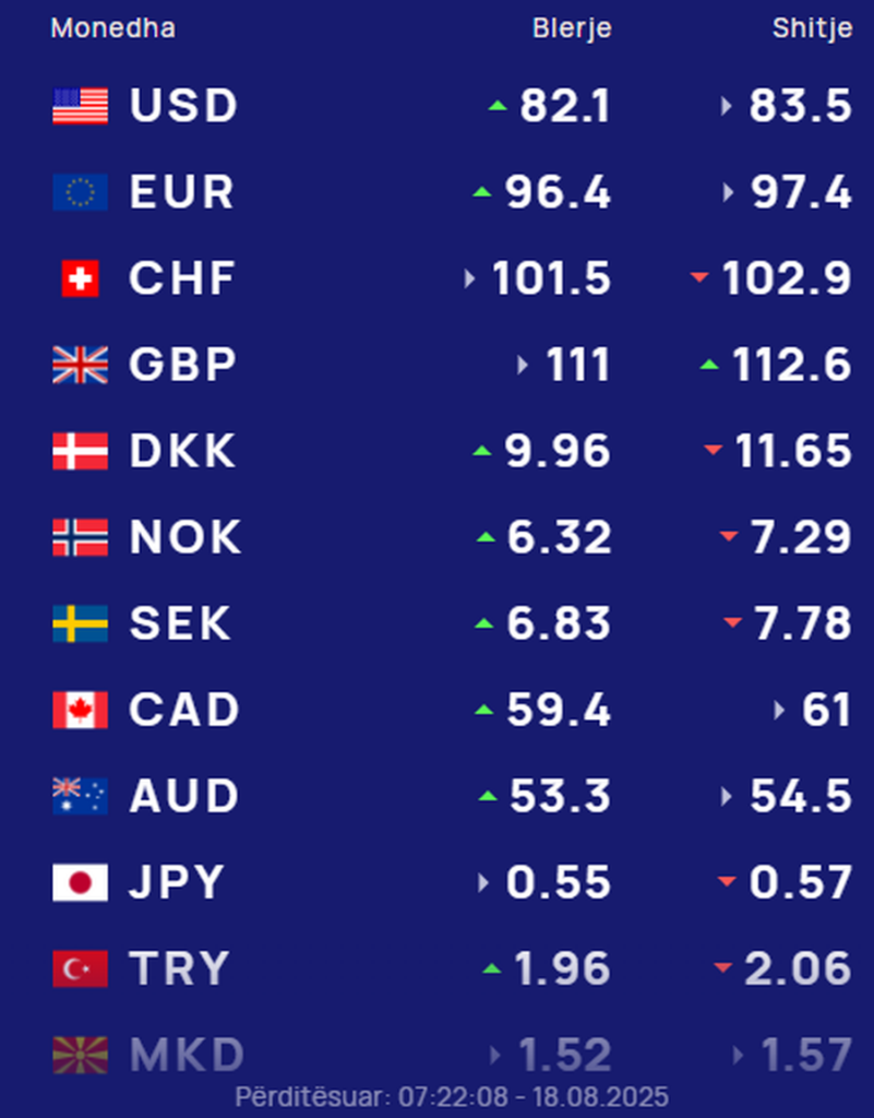 Më poshtë, po sjellim të dhënat e këmbimin valutor, për të gjitha valutat e huaja kryesore: