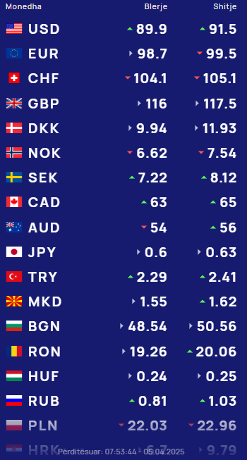 Më poshtë, po sjellim të dhënat e këmbimit valutor, për monedhat e huaja kryesore: