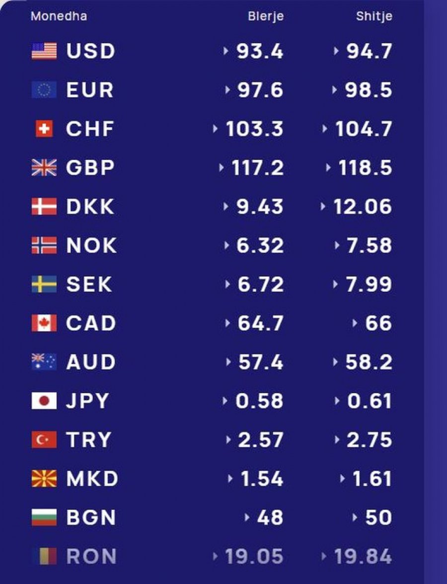 Euro blihet me 97.6 lekë dhe shitet 98.5 lekë.