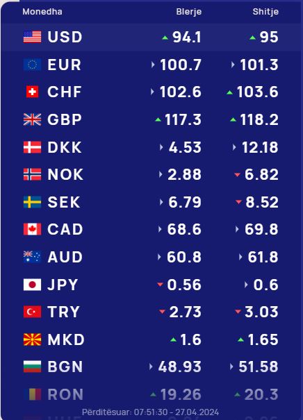 Në tregun e këmbimit valutor sot një dollar do blihet me 94.1 lekë dhe do shitet me 95 lekë. Monedha evropiane euro do blihet me 100.7 lekë dhe do shitet me 101.3 lekë.