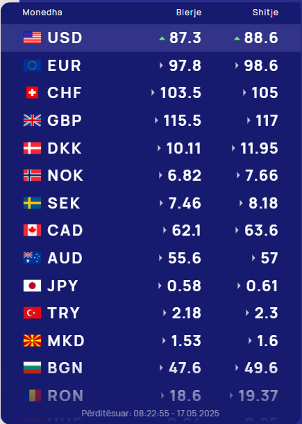 Ndërsa paundi britanik do blihet me 115.5 lekë dhe do shitet me 117 lekë.