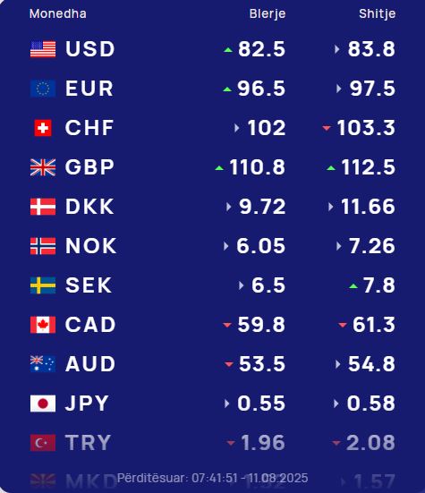 Ndërsa paundi britanik do blihet me 110.8 lekë dhe do shitet me 112.5 lekë.