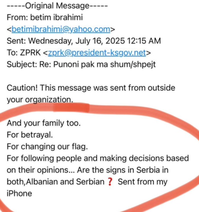 “”Edhe familja jote. Për tradhti. Për ndërrimin e flamurit tonë. Për ndjekjen e njerëzve dhe marrjen e vendimeve bazuar në mendimet e tyre… A janë shenjat në Serbi në të dyja gjuhët, shqip dhe serbisht?””, shkruhet ndër të tjera në emailin e dërguar më 16 korrik në ora 00:15.