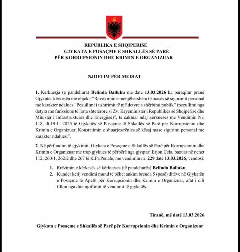 Gjykata e Posaçme e Shkallës së Parë për Korrupsionin dhe Krimin e Organizuar (GJKKO) ka rrëzuar kërkesën e ish-zëvendëskryeministres dhe ish-ministres së Infrastrukturës dhe Energjisë, Belinda Balluku, për revokimin e menjëhershëm të masës së sigurimit personal që e pezullon nga ushtrimi i funksioneve publike.
