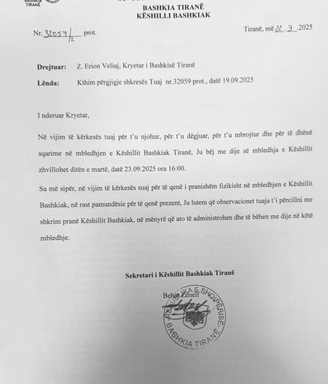 Pjesë nga përgjigjja ndaj Veliajt: “Sa më sipër, në vijim të kërkesës suaj për të qenë i pranishëm fizikisht në mbledhjen e Këshillit Bashkiak, në rast pamundësie për të qenë prezent, Ju lutem që observacionet tuaja t’i përcillni me shkrim pranë Këshillit Bashkiak, në mënyrë që ato të administrohen dhe të bëhem me dije në këtë mbledhje”.