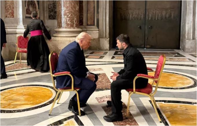 Presidenti i SHBA-së, Donald Trump, dhe udhëheqësi ukrainas, Volodymyr Zelensky, u takuan për rreth 15 minuta në Bazilikën e Shën Pjetrit në Vatikan.