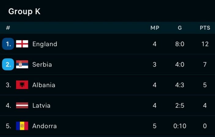 Kështu, Anglia ndodhet në vendin e parë me 12 pikë të plota dhe është një hap larg kualifikimit në Botërorin 2026. Ndërkohë vendi i dytë që të dërgon në play-off e ka marrë momentalisht Serbia me 7 pikë.