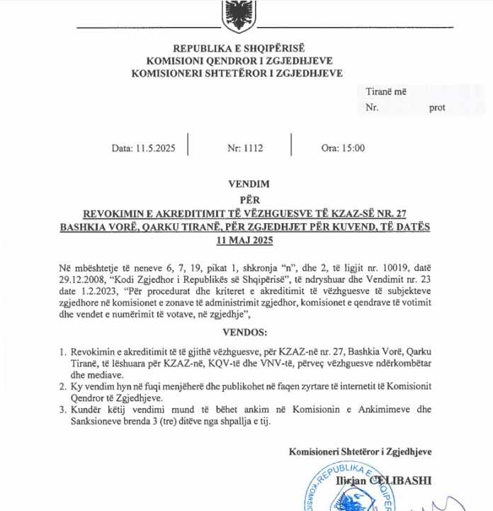 Revokimin e akreditimit të të gjithë vëzhguesve, për KZAZ-në nr. 27, Bashkia Vorë, Qarku Tiranë, të lëshuara për KZAZ-në, KQV-të dhe VNV-të, përveç vëzhguesve ndërkombëtar dhe mediave.