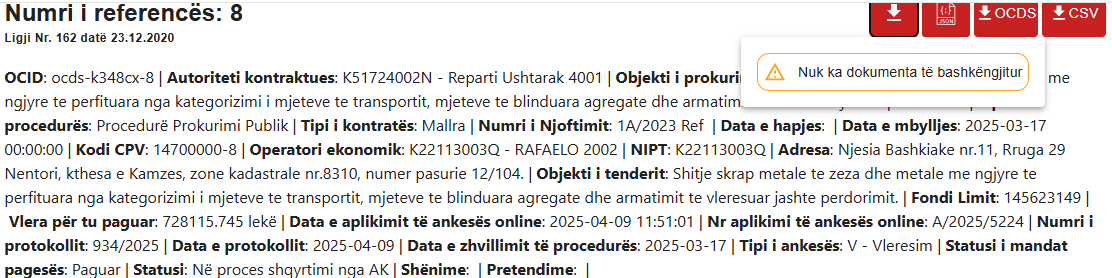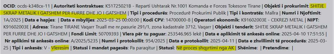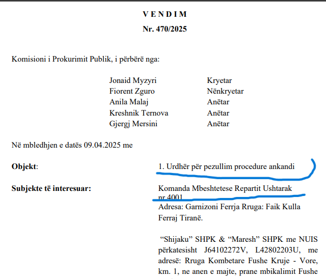 Komisioni i Prokurimit Publik, pasi dëgjoi relatorin e çështjes dhe shqyrtoi informacionin e paraqitur nga kandidati ankimues, vëren se ““Shijaku” SHPK & “Maresh” SHPK kundërshtojnë vendimin e autoritetit shitës Komanda Mbështetëse Repartit Ushtarak nr.4001, për skualifikimin në procedurën e ankandit publik me objekt të shitjes “Shitje skrap metale të zeza dhe metale me ngjyrë” të përftuar nga kategorizimi i mjeteve të transportit, mjeteve të blinduara, agregateve dhe armatimit të vlerësuar jashtë përdorimit”, me vlerë fillestare 145,623,149 lekë. Dokumentet e kompanive mund të dorëzoheshin deri më 10 mars 2025, por tashmë ankandi është i pezulluar.