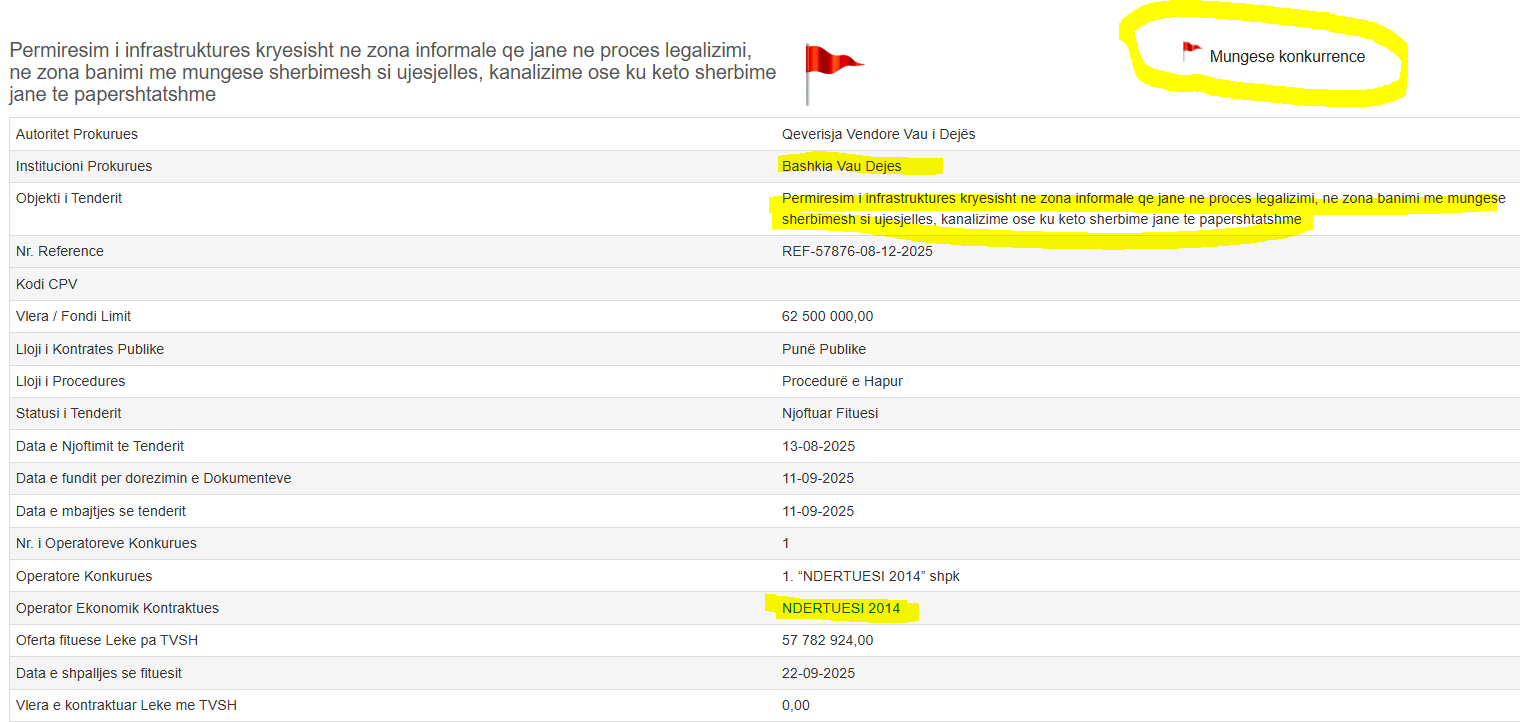 Open Data Albania e ka shënuar procedurën me “Flamur të kuq”, që është shenja e riskut të korrupsionit.