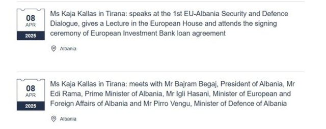 Po ashtu Kallas do të marrë pjesë në forumin e dialogut Shqipëri-BE për politikën e sigurinë dhe më pas në ceremoninë e marrëveshjes me Bankën Europiane të Investimeve, thuhet në faqen zyrtare të Komisionit Europian.