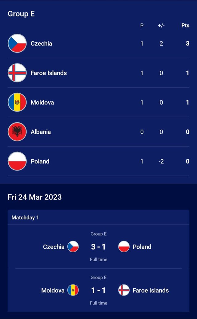 Me këto rezultate të para, Çekia udhëheq grupin me 3 pikë të plota e ndjekur me nga një pike nga Moladvia dhe Ishujt Faroe, ndërkaq në vendin e fundit me 0 pikë nodhet Polonia me një golavarazh 3-1 nga takimi i sotëm. Po me zero pike është edhe Shqipëria, që eliminatoret e sajë do t’i nisë nga Varshava ditën e hënë më 27 mars përballë vendasve polakë.