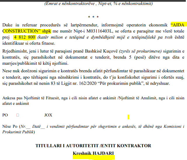 Duhet të theksojmë se kompania fituese “Aida Construction” nuk duhej kualifikuar për këtë tender pasi nuk plotëson kriterin financiar.