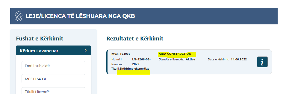 Nga ana tjetër, pas një kontrolli që bëmë në regjistrin e licencave në QKB, na rezulton se “AIDA Construction” shpk ka vetëm një licencë të lëshuar në 2022, dhe ajo është për ekspertizë mbi sistemet e mbrojtjes nga zjarri.