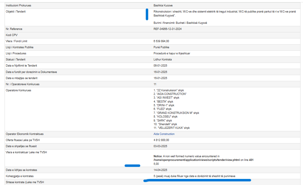Tenderi me objekt “Rikonstruksion i sheshit, W.C-ve dhe sistemit elektrik të tregut industrial, W.C-të publike pranë parkut të ri e W.C-ve pranë Bashkisë Kuçovë”, që e iu dha kompanisë “Aida Construction” shpk e kishte Fondin Limit 6 539 894,00 lekë pa TVSH, por situata faktike tregon se paratë kanë shtuar fitimet e pronarit dhe një pjesë në xhepat e zyrtarit të korruptuar.