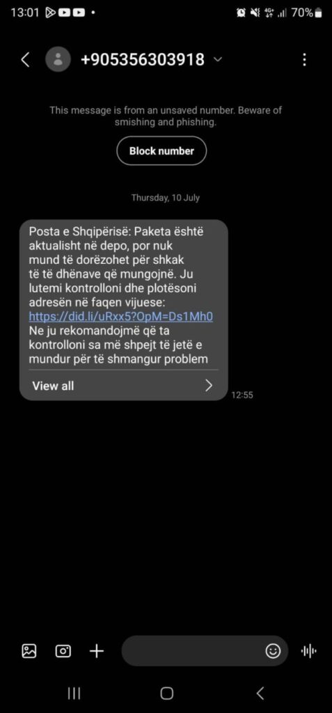 Duket se deri më tani Autoriteti Kombëtar për Sigurinë Kibernetike (AKSK) ka dështuar në bllokimin e mesazheve mashtruese me linqe të dyshimta, të kamufluara si Posta Shqiptare, ku synimi është vjedhja e të dhënave bankare të qytetarëve, për t’u grabitur më pas shumat e lekëve që kanë në llogaritë e tyre.