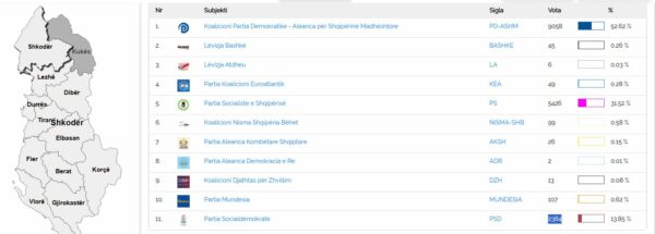 Një qarkun e Kukësit janë numëruar 69 nga 139 kuti. Partia Demokratike- Aleanca për Shqipërinë Madhështore ka siguruar 9058 vota, ndërsa Partia Socialiste ka marrë 5426 vota.
