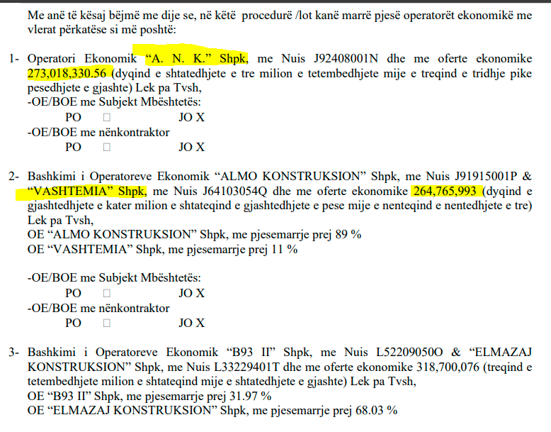 Edhe ofertat e tjera të shpallura të suksesshme janë akoma më të larta. Kështu, Bashkimi i Operatoreve Ekonomik “B93 II” Shpk, & “ELMAZAJ KONSTRUKSION” Shpk, e përfaqësuar nga Ardit Licaj, e kishte ofertën ekonomike 318,700,076 Lek pa Tvsh.