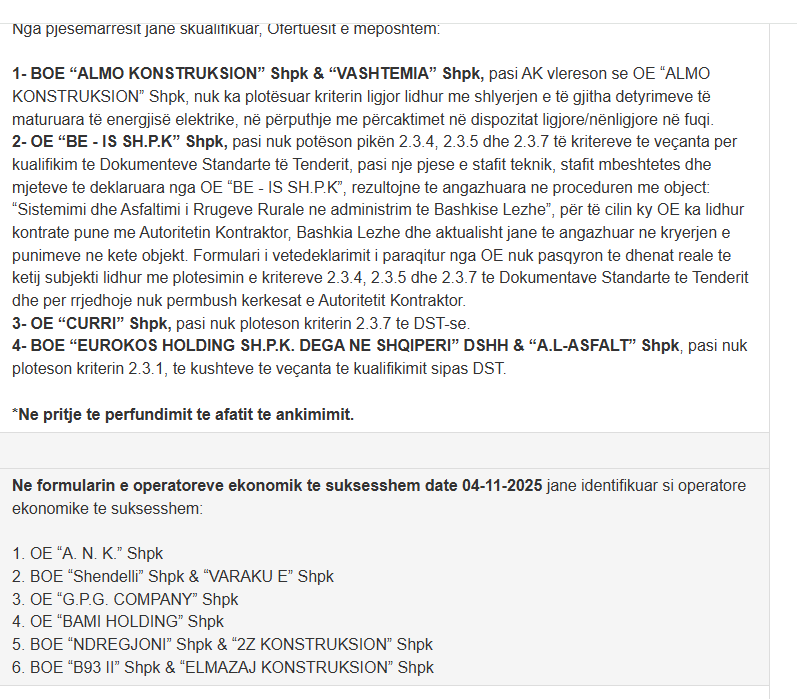 Nga 10 operatorë ekonomikë që u regjistruan, në fazën e parë, komisioni ka eliminuar menjëherë 4 prej tyre, që ishin me oferta më ekonomike. Të bën përshtypje fakti, se është skualifikuar oferta e bashkimit të operatorëve Ekonomik “ALMO KONSTRUKSION” Shpk, & “VASHTEMIA” Shpk, me vlerë 264,765,993 Lek pa Tvsh.