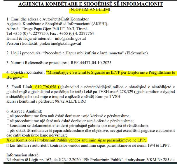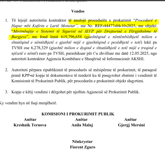 Më 28 korrik dhe 18 gusht 2025, Komisioni i Prokurimit Publik (KPP) ka marrë dy vendime për tenderin e kamerave dhe skanerëve të burgjeve që organizohet nga Agjencia Kombëtare e Shoqërisë së Informacionit (AKSHI). Njëri kërkonte ndarjen në lote të prokurimit, tjetri miratonte anulimin e tij. Të dy këto akte janë shpërfillur nga shefja e AKSHI-t, Mirlinda Karçanaj. Sipas ligjit, duhej që brenda 5 ditëve të zbatohej vendimi. Më në fund, në datën 15 shtator, AKSHI ka nxjerrë njoftimin e anulimit të procedurës.
