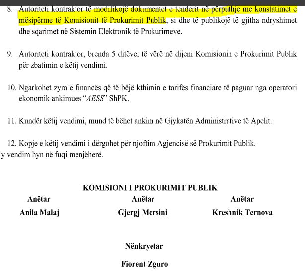 “Nisur nga fakti se autoriteti kontraktor nuk ka argumentuar teknikisht dhe ligjërisht mosndarjen në lote të procedurës, KPP gjykon, se autoriteti kontraktor duhet të marrë masa për të ndarë procedurën e prokurimit në lote”, theksohet ndër të tjera në vendim. Por AKSHI, as nuk e anuloi procedurën e shpallur, as nuk i rishikoi termat e referencës.