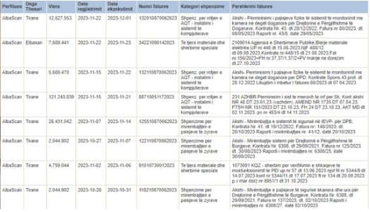 Sipas dokumentit më sipër, në datën 14 dhjetor 2023 Thesari i Shtetit ekzekutoi një pagesë në vlerën 28 milionë e 431 mijë lekë ose rreth 278 mijë euro për kompaninë AlbaScan. Kjo ishte pagesa e muajit e kontratës për “Mirëmbajtjen e sistemit të sigurisë në Institucionet e Ekzekutimit të Vendimeve Penale” për Drejtorinë e Burgjeve.