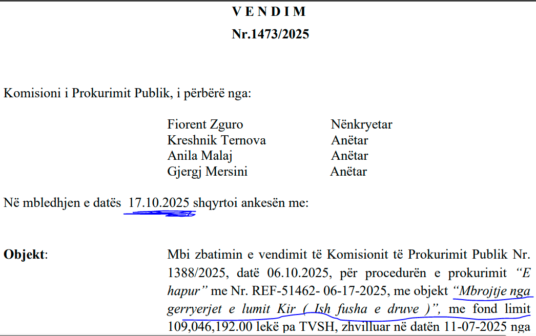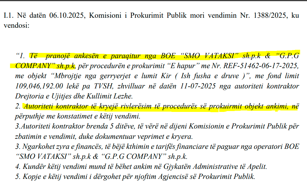 Më datë 5 gusht 2025, “GPG Company” kërkoi në Komisionin e Prokurimit Publik (KPP) shfuqizimin e vendimit tё Komisionit të Vlerësimit të Ofertave për skualifikimin e ofertës të paraqitur nga BOE “SMO VATAKSI” sh.p.k & “G.P.G COMPANY” sh.p.k në procedurën e prokurimit me objekt “Mbrojtje nga gërryerjet e lumit Kir (Ish fusha e druve )”, me fond limit